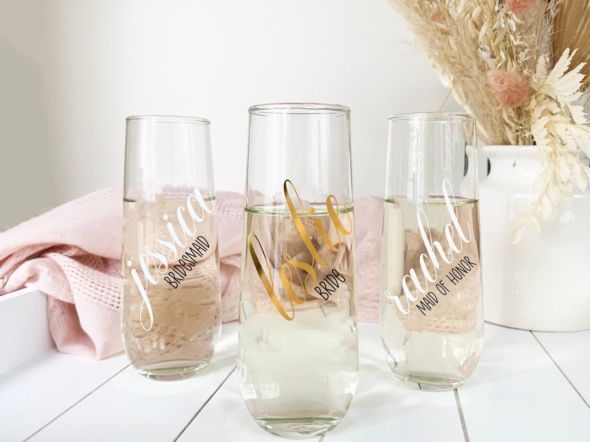 Celebrate your special occasion with these personalized champagne glasses for bridesmaid, maid of honor, and bride. These champagne glasses can add perfect touch to your wedding, bachelorette party, birthday party, etc.