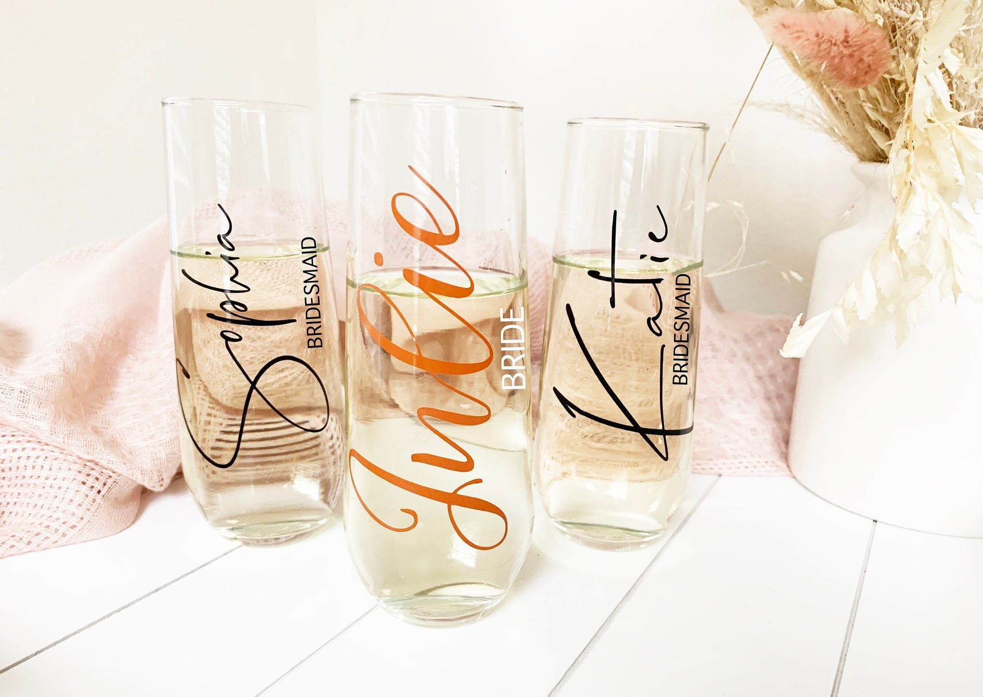 Celebrate your special occasion with these personalized champagne glasses for bridesmaid, maid of honor, and bride. These champagne glasses can add perfect touch to your wedding, bachelorette party, birthday party, etc.